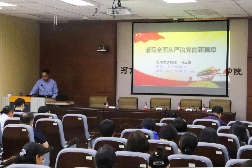 政治系党支部书记、党史专家何云峰教授以“谱写全面从严治党的新篇章”为题,分别梳理了革命年代、社会主义革命、建设时期和改革开放新时期的党建工作。他重点阐述了十八大以来全面从严治党的工作取得的成就,明确提出了全面从严治党的实现路径。他表示只要我们党把自身建设好、建设强,确保党始终同人民想在一起、干在一起,就一定能够建设伟大工程,进行伟大斗争,推进伟大事业,实现伟大梦想。
