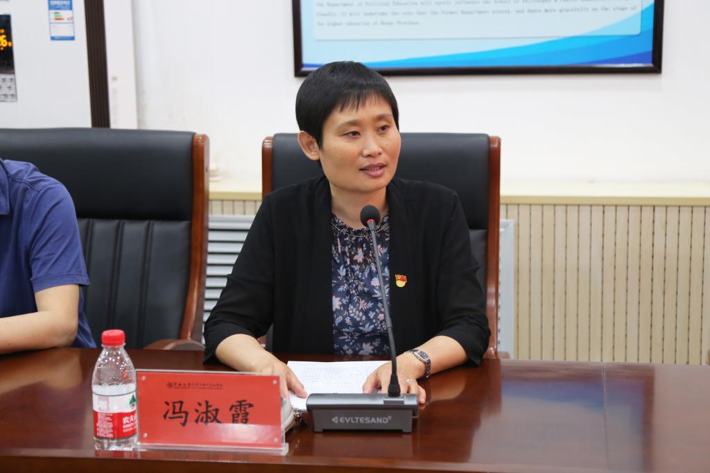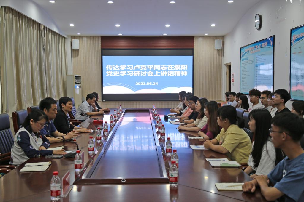 6月24日下午,校党委常委、副校长冯淑霞到麻豆做爱 传达学习校党委书记卢克平同志在濮阳党史学习研讨会上的讲话精神。会议在学院第二会议室举行,学院全体领导班子、教工学生各支部党员代表参与了此次学习。
