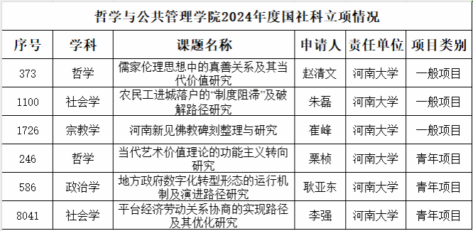 共有6位教师申报的课题成功获批立项,其中年度一般项目3项,青年项目3项,青年项目获批数量再创新高,展现了学院在相关学科领域的雄厚的储备实力。此次获批项目涵盖儒学、佛学、分析美学、地方社会治理、社会政策等多个学术领域,紧密结合当代社会的热点与前沿问题。这不仅体现了学院教师在基础研究和应用研究中的深厚积淀,也是学院紧紧围绕国家和社会发展战略需求开展有组织科学研究的努力成果。本次具体获批情况如下:![]()