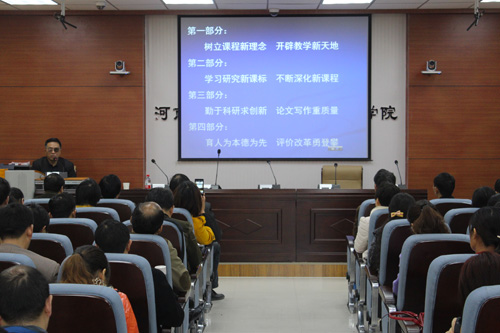 11月13日上午,河南省基础教研室文科一室主任、文科支部党总支部书记、特级教师王向阳在麻豆做爱 三楼会议室为国培学员做了以“深化课程改革,追踪学科前沿”为题的讲座。百余位中小学教师代表参加本次讲座。