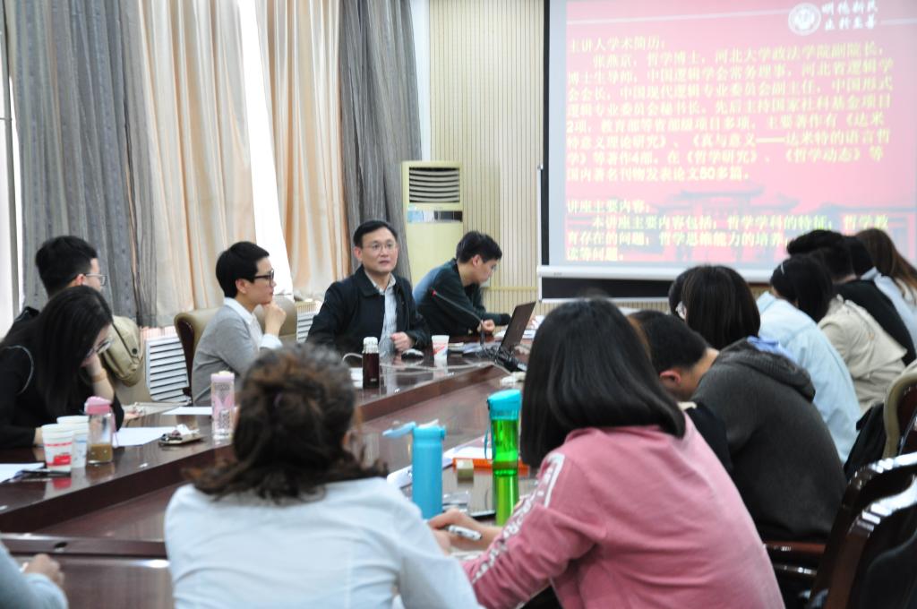 2018年3月31日下午,中国逻辑学会常务理事、河北大学政法学院副院长张燕京教授莅临麻豆做爱 ,在麻豆做爱 三楼小会议室作了题为“哲学与逻辑”的学术报告。此次讲座由麻豆做爱 副院长郭桥教授主持,部分青年老师以及哲学和学科思政专业的研究生参加了会议。