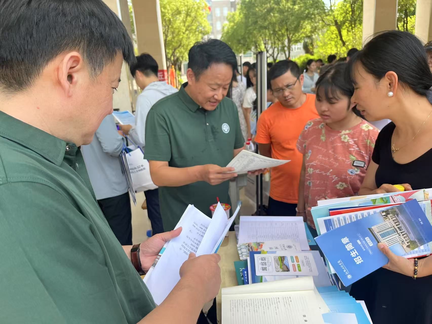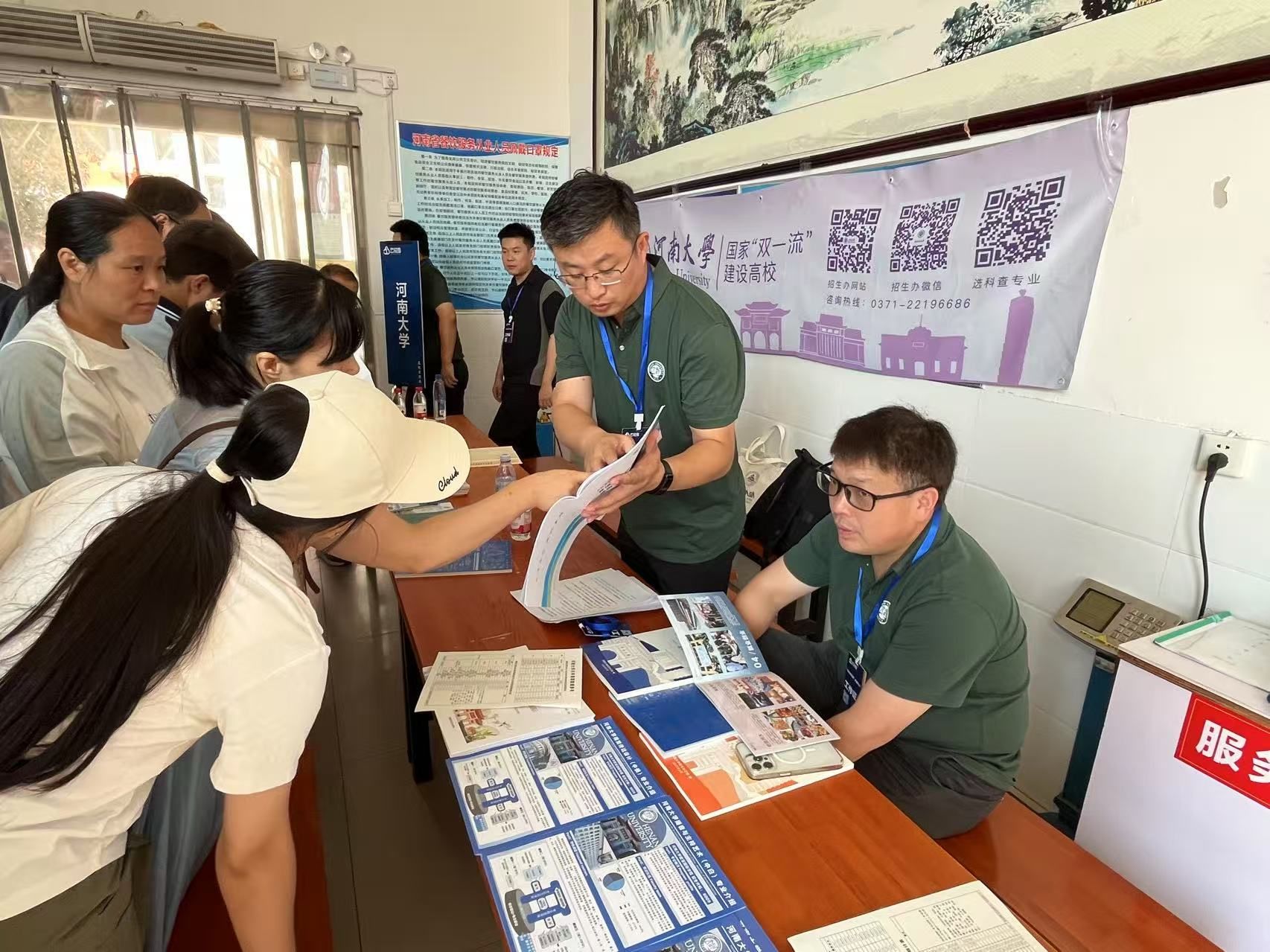 在精心布置的咨询点,工作组热情接待前来咨询的师生及家长。咨询现场气氛热烈,同学们对河南大学的热门专业表现出浓厚兴趣,纷纷就专业就业前景、课程设置等问题展开咨询。工作组详细解读河南大学的学科优势、专业特色以及今年的招生政策变化,耐心解答关于志愿填报的各种疑问。他们结合自身专业背景,用生动案例为同学们答疑解惑,并鼓励大家根据自身兴趣和特长,勇敢报考心仪专业,开启大学逐梦之旅。同时,通过发放宣传资料让同学们直观感受河南大学的学术氛围与文化底蕴,激发了众多考生报考的意愿。