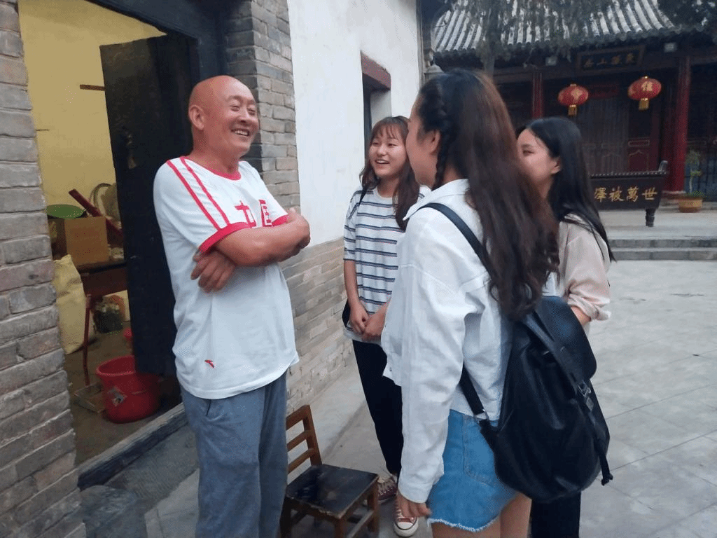 村落转型调研,感受文化氛围。初达北朱村,队员们便惊叹于村口恢宏气派的“北朱村”牌匾,整洁有序的市井街道和文化墙,几乎每户人家都挂着寓意深刻的门匾。途径奶奶庙,感受到浓郁的烟火气息和寻常百姓的希冀。走进古槐街,许多遗存的明清古民居都被修缮保护,队员们被醇厚的历史文化气韵包围着。在随后的实践活动中,队员们从村委干部口中了解了北朱村的前世今生。正如村委委员张新九所说:“原来因农耕为生,因煤矿而兴的北朱村,在资源日益枯竭和环保主流的形势下,村委努力主导,村民大力支持,村子走上了转型发展之路,基于村落实际和特色,依靠着传统村落、传统文化努力打造文旅旅游村,一个传统古村落正在涅槃重生!”北朱村的转型之路正不断向前进着。