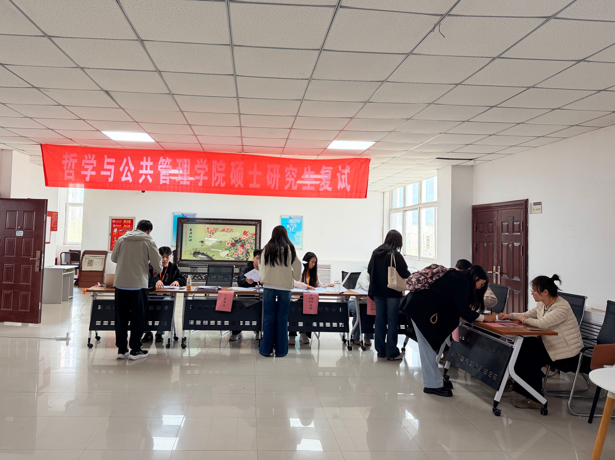 3月31日至4月1日,全日制学术型和专业学位研究生复试有序开展。4月2日至4月3日非全日制公共管理硕士(MPA)专业学位研究生复试工作顺利进行。4月8日至4月9日全日制社会工作硕士专业学位研究生调剂复试工作有条不紊地得以开展。在整个复试工作中,共有来自24省份、367名考生参加学院3个一级学科、3个专业学位硕士点招生复试。从入场签到、身份核验,到笔试面试全程,均有志愿者提供引导服务,确保各环节无缝衔接、流程顺畅。在考务管理方面,考场均配置全覆盖的录音录像设备,考核资料均按要求规范存档备查。面试全程采用“随机确定考生次序、随机抽取试题、随机分配考官”的“三随机”机制,确保考核的公平性与科学性。复试期间,学院党委书记党鸿军等领导班子成员多次深入各考场巡查指导,实时掌握考场动态,并在候考区亲切慰问考生,鼓励大家放松心态、沉着应考,充分展现专业素养与综合能力。