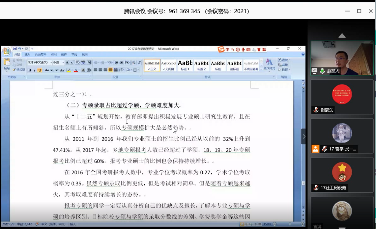 5月28日下午,学院以腾讯会议为平台,开展了线上考研政策宣讲会。宣讲会主题为“把握宏观趋势,科学做出选择”,学院副院长赵炎峰出席会议并担任主讲,2017级140余名学生参会。