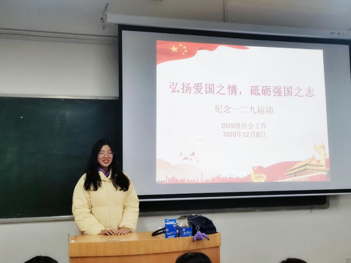 活动开始,团支书站上讲台,借助PPT介绍一二·九运动的历史意义及精神内涵,激励同学们铭记历史,珍惜当下。随后,各支部采取多种形式学习感悟一二·九精神。其中,2019级、2020级通过集体观看一二·九运动相关影片加深对抗战历史的学习,激发团员爱国精神。影片中振奋人心的画面把大家带回曾经的峥嵘岁月,大家纷纷表示被舍生忘死、英勇无畏的精神深深震撼,2019级行管二班团支部张高豪说:“那段历史虽然离我们已然遥远,但是那种精神却永远不会埋没于历史的长河中,一个时代有一个时代的使命,我们青年学生应从自己做起,关注国家时事,把握时代脉搏,承担历史使命,让一二·九精神永不褪色。”