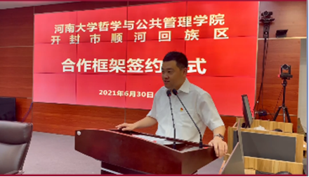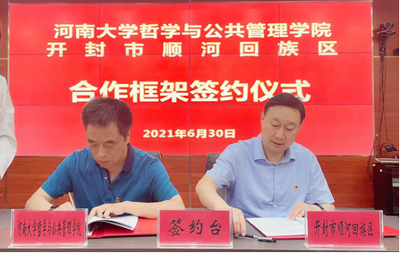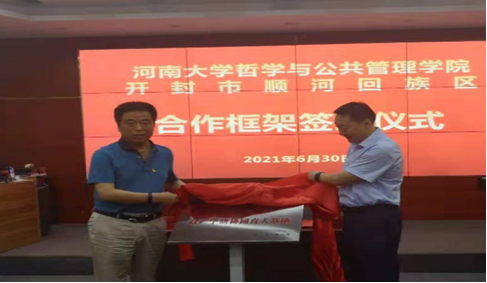 党委书记马润成与顺河回族区委书记白海富共同签订合作协议书,共同为政产学研协同育人基地揭牌。双方表示,将以此次签约为契机,推进深度合作,以高质量的教育努力践行“为党育人为国育才”的人才培养理念,以实际行动献礼党的百年华诞。