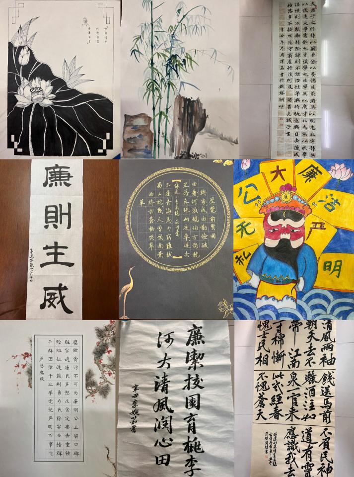 11月22日至12月2日,在“廉洁作品创作活动”中,学生积极参与,热情高涨,投稿数量再创高峰。一笔一划尽显沉稳大气,一撇一捺皆为俊逸骨风。参赛选手用铿锵有力的书法、水墨丹青的绘画、笔酣墨饱的诗歌描绘着对廉洁的理解,诉说着对清廉的向往。