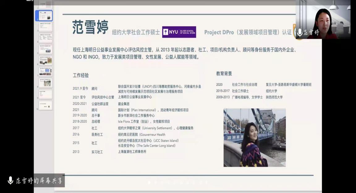 3月19日上午,学院召开社会工作专业认知线上分享会。联合国开发计划署项目顾问、上海明日公益事业发展中心范雪婷,上海爱德公益研究中心执行总干事丁杨阳两位女士受邀参会。学院副院长田丰韶、社会工作系主任白雪苹及部分专业教师、社会工作专业本科生参与此次活动。