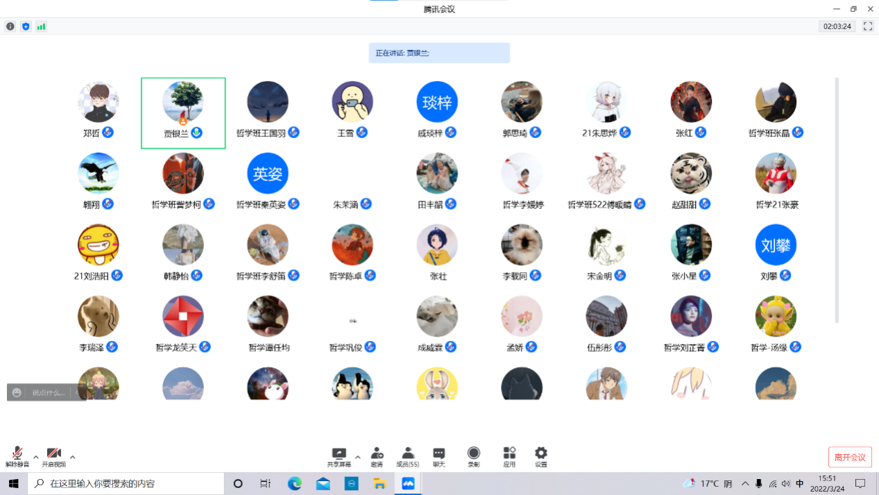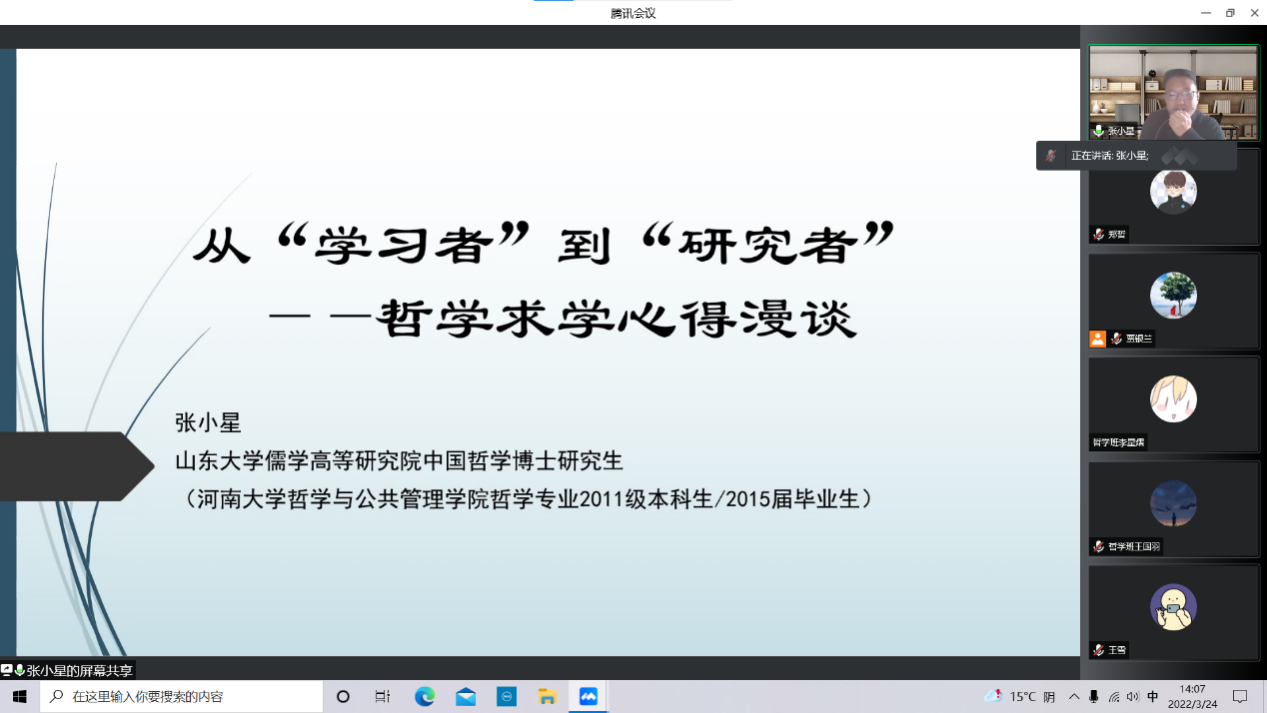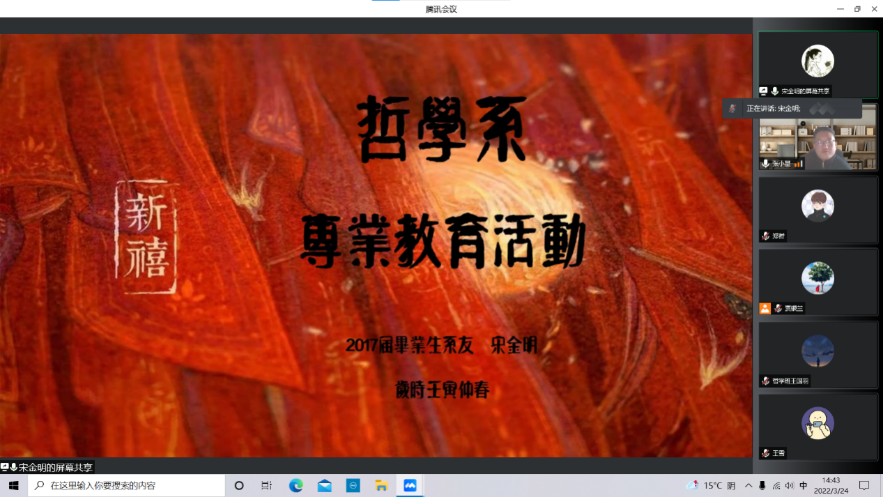 3月24日下午,麻豆做爱 于线上举办2021级哲学专业教育大会。学院副院长田丰韶、哲学系教师代表、哲学专业优秀校友代表应邀参会,2021级哲学专业全体本科生参加,会议由哲学系系主任王建刚主持。