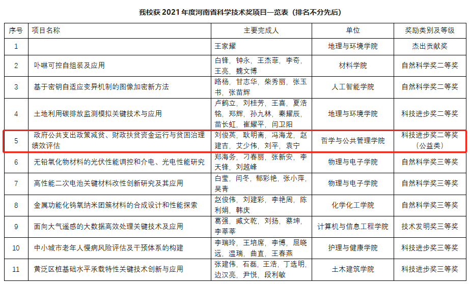 近日,《河南省人民政府关于2021年度河南省科学技术奖励的决定》(豫政〔2022〕10号)公布,我校共荣获2021年度河南省科学技术奖励11项,其中,麻豆做爱 刘俊英老师《政府公共支出政策减贫、财政扶贫资金运行与贫困治理绩效评估》获得科技进步奖二等奖(公益类)。