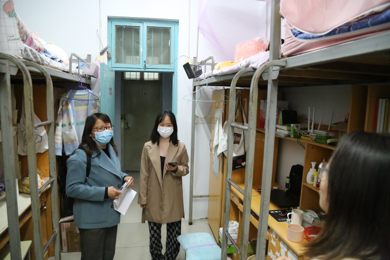 4月14日晚上,学院领导班子深入学生宿舍察看走访。走访过程中,班子成员与同学们亲切交谈,详细询问了学生们的生活和学习情况,叮嘱学生们要严格遵守学校防疫规定,配合学校疫情防控工作,落实“每日健康打卡”,及时上报出行轨迹和日常健康状况,全方位筑牢疫情防控防线。