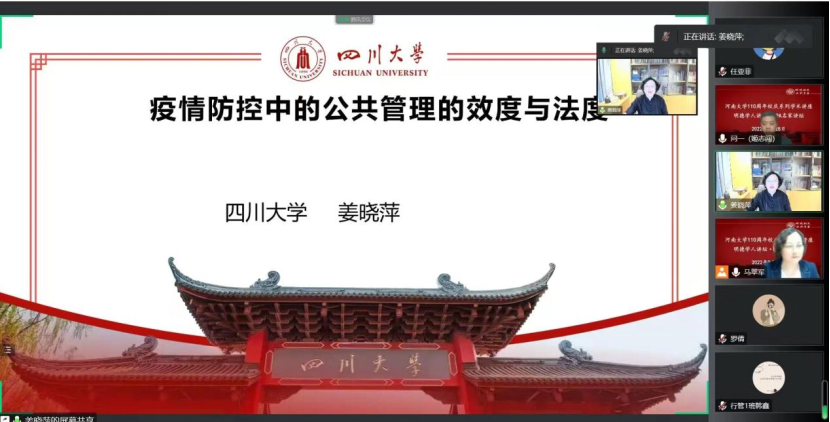 9月28日下午,河南大学110周年校庆哲管院系列学术讲座之明德学人讲坛系列第14场举行。应麻豆做爱 邀请,四川大学姜晓萍教授在线作了题为《疫情防控中公共管理的效度和法度》的学术报告。此次讲座由麻豆做爱 院长姬志闯教授主持,公共管理及相关学科的师生通过线上的方式共同参与了此次讲座。