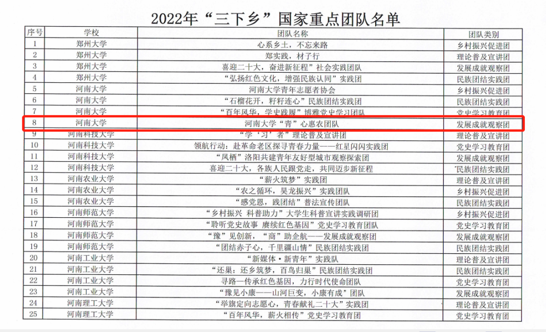 据悉,河南大学“青”心惠农团队经学校考核、省级选拔,成功获得2022年“三下乡”国家重点团队立项;其中,2020级本科生丁培涵积极参与策划学院暑假“三下乡”社会实践活动,并作为该团队的副队长,在“三下乡”工作中表现突出,被共青团河南省委评选为2022年全省暑期“三下乡”社会实践活动优秀个人。