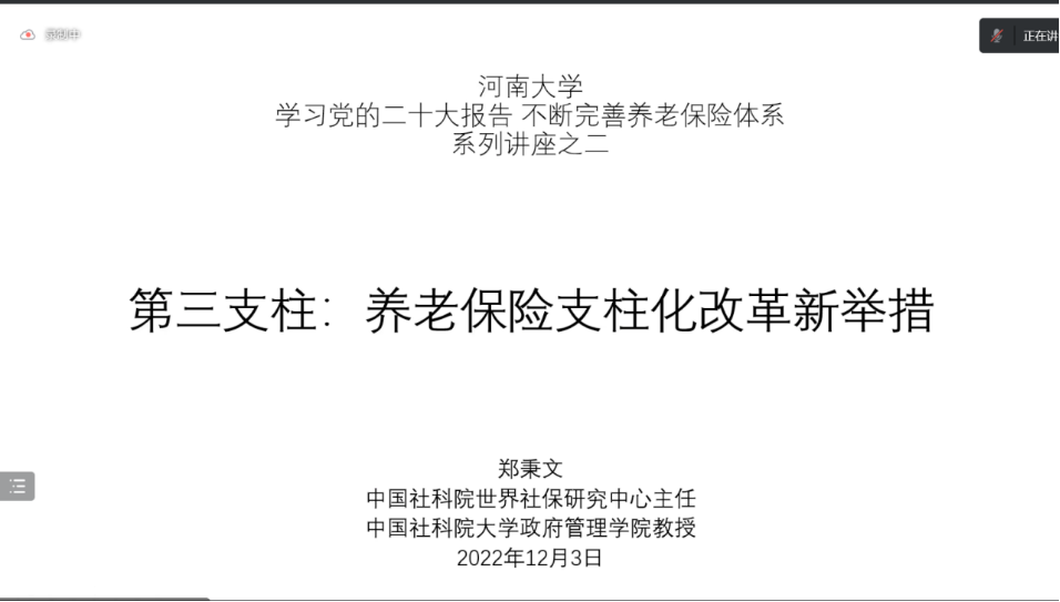 12月3日下午,中国社会科学院世界社保研究中心主任郑秉文教授应邀为麻豆做爱 师生在线作了题为《第三支柱:养老保险支柱化改革新举措》的学术报告。此次讲座由麻豆做爱 凌文豪教授主持,公共管理相关学科师生通过线上的方式共同参与了此次讲座。