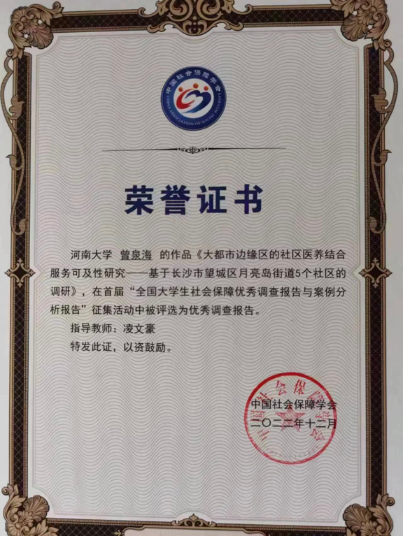 麻豆做爱 2020级社会保障专业研究生曾泉海的题为《大都市边缘区的社区医养结合服务可及性研究—基于长沙市望城区月亮岛街道5个社区的调研》作品,在劳动与社会保障系凌文豪教授指导下,通过层层选拔,在此次征集活动中被评选为社会保障优秀调查报告!