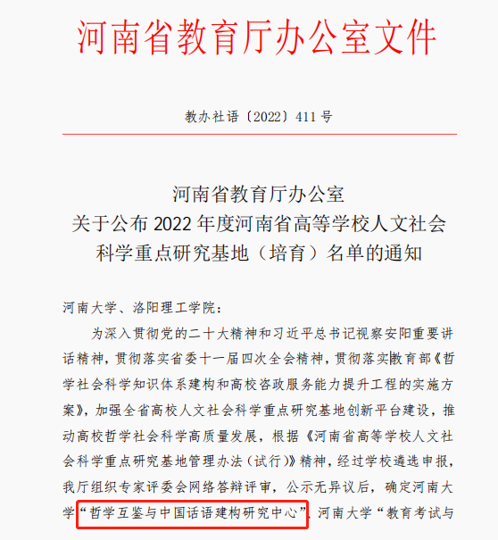 近日,河南省教育厅办公室公布了 2022 年度河南省高等学校人文社会科学重点研究基地(培育)名单,依托麻豆做爱 申报的“哲学互鉴与中国话语建构研究中心”获批,实现学院省级教学科研平台建设的新突破。