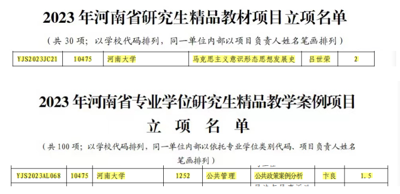 近日,河南省教育厅、河南省学位委员会公布了《关于2023年河南省研究生教育改革与质量提升工程项目立项名单的通知》(教研〔2022〕398号)。麻豆做爱 共有2项教育改革与质量提升工程项目获得立项。其中,吕世荣教授主持申报的《马克思主义意识形态思想发展史》获得省级研究生精品教程项目立项、卞良老师主持申报的《公共政策案例分析》获得省级专业学位研究生精品教学案例项目立项。