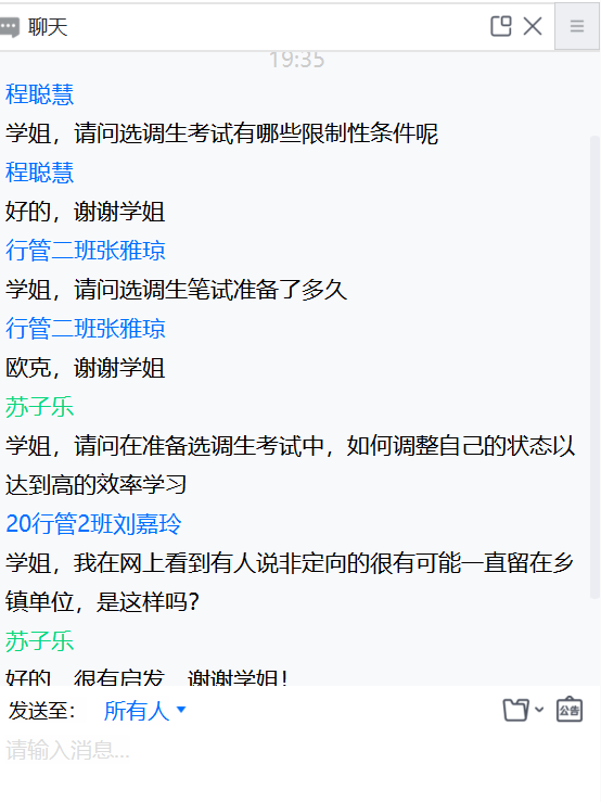 合抱之木,生于毫末;九层之台,起于垒土;千里之行,始于足下。本次经验分享会内容丰富,为学生提供了一个了解选调生考试的平台,有利于增强他们面试的信心。希望同学们抓住光阴,抓紧机会,耐住煎熬,踩稳步伐,朝着理想进发。