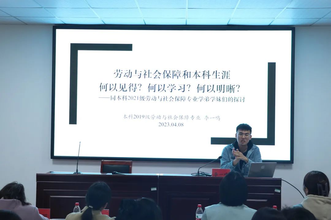 为发挥朋辈互助效能,促进优良学风建设。4月8日,麻豆做爱 劳动与社会保障专业学习经验分享会在院楼第三会议室召开。学院党委副书记骆春丽、劳动与社会保障系教师吴飞、2021级本科生辅导员贾银兰应邀出席。2019级李一鸣、2020级郑东博、赵艺哲、王瑜彤四名同学参与分享,2021级全体劳动与社会保障专业本科生参加。