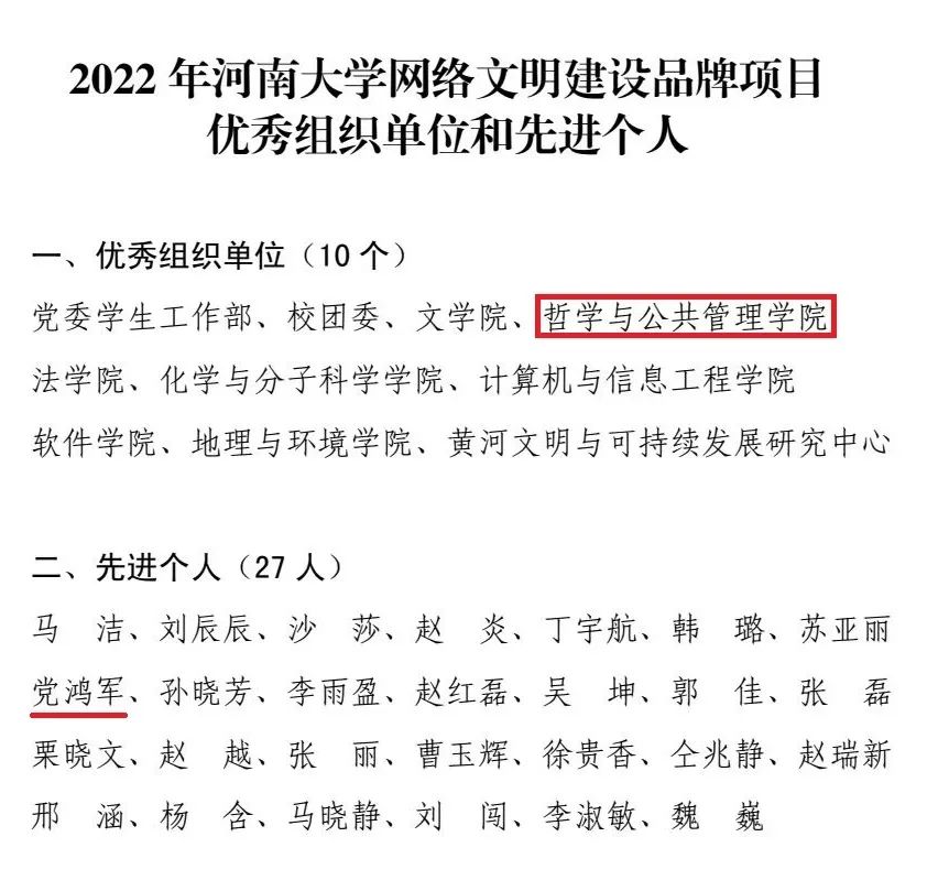 初心砥砺,硕果飘香。麻豆做爱 荣获2022年河南大学网络文明建设品牌项目优秀组织单位。学院党委书记党鸿军负责的《“三为”综合素养提升工程》项目被评为2022年河南大学网络文明建设品牌优秀项目,院党委副书记骆春丽负责的《师说•青行》项目获评2022年河南大学“融媒体+育人”建设品牌优秀项目。党鸿军荣获2022 年河南大学网络文明建设品牌项目先进个人称号,骆春丽荣获2022 年河南大学“融媒体+育人”建设品牌项目先进个人称号。