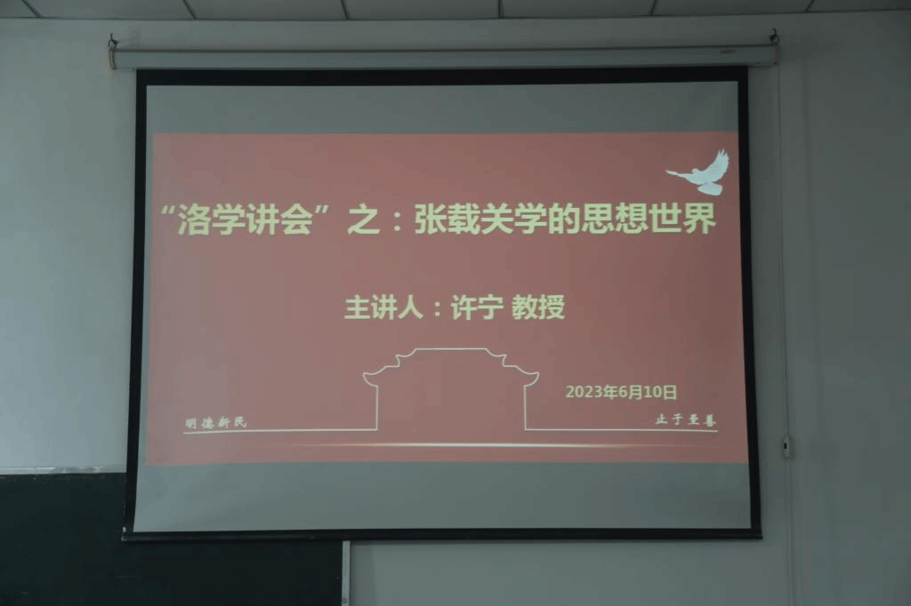 许宁教授首先引申张载的“为天地立心,为生民立命,为往圣继绝学,为万世开太平”四句教,向同学们展示哲学社会科学工作者的时代使命,接着,通过对朱熹、王夫之等后学对张载生平与志向抱负所作评论的诠释,许宁教授开始了今天的讲座主题——张载关学的思想世界。许宁教授指出,“以气为本,以礼为教”这八个字概括了张载的思想,前四个字为形上层面,讲述了“太虚”与“气”之间相分相合的关系,相分强调的是太虚本体的超越性和逻辑的先在性,这构成了宇宙本体论层次,相合强调的是太虚与气的关联性和无分先后的共在性,这构成了宇宙生成论层次,由此,张载提出了著名论断——“由太虚,有天之名;由气化,有道之名;合虚与气,有性之名;合性与知觉,有心之名”,张载以此构建了整个理学纲领的基本框架;后四个字为实践层面,体现为关学学派的“乡约”,乡约分为四个方面,分别是德业相劝、过失相规、礼俗相交、患难相恤,对应着儒家“仁”“智”“礼”“义”四德。最后,许宁教授重点分析了张载《西铭》篇的要义,指出“吾”与“其”是篇中关键字眼,具有道德超越性,体现了张载对于宇宙人生最高的觉解,达到了“天地境界”。