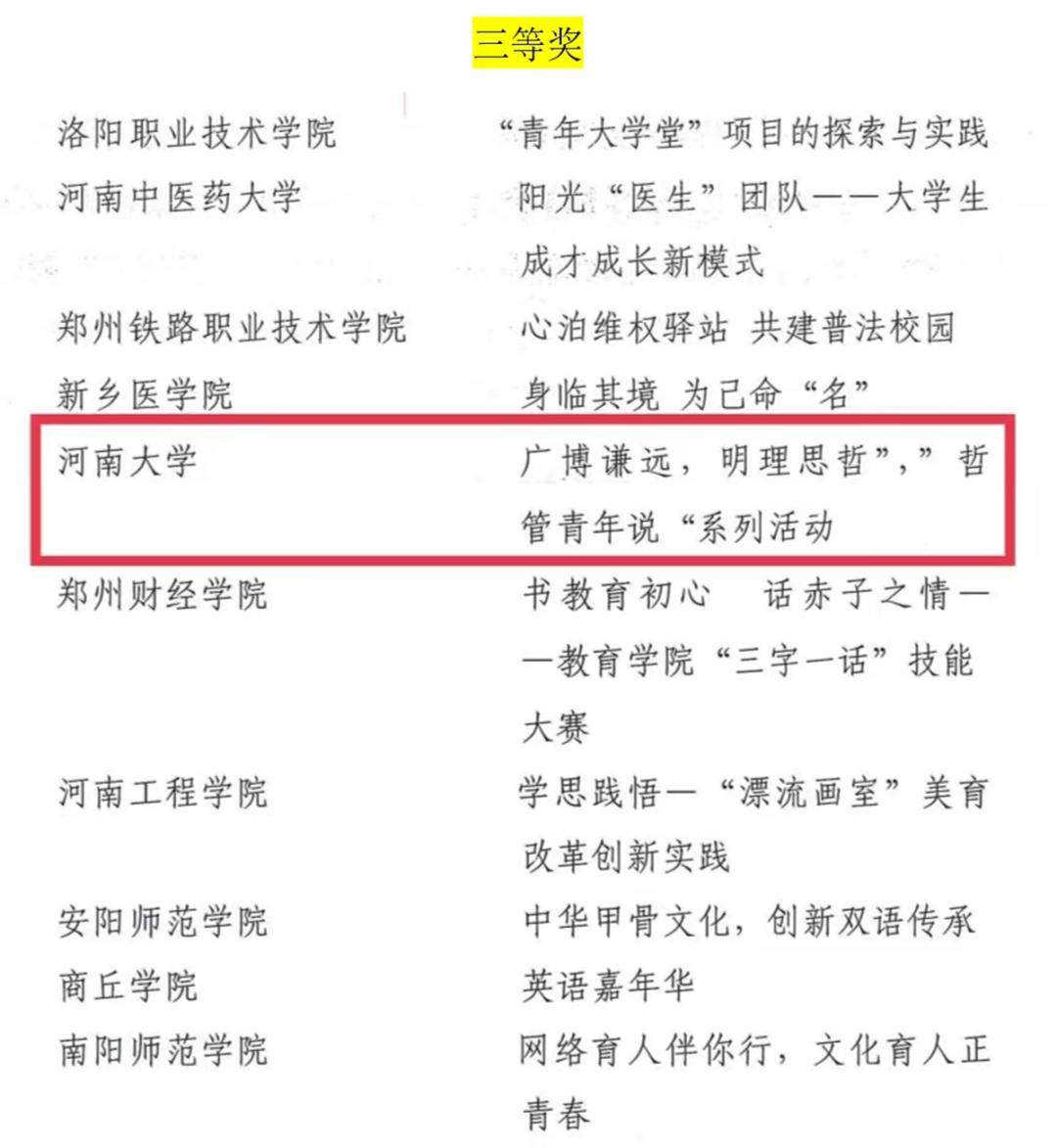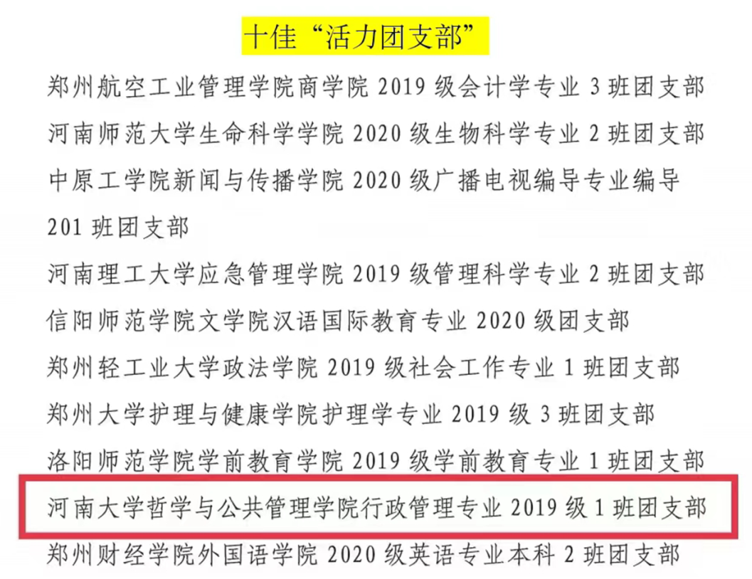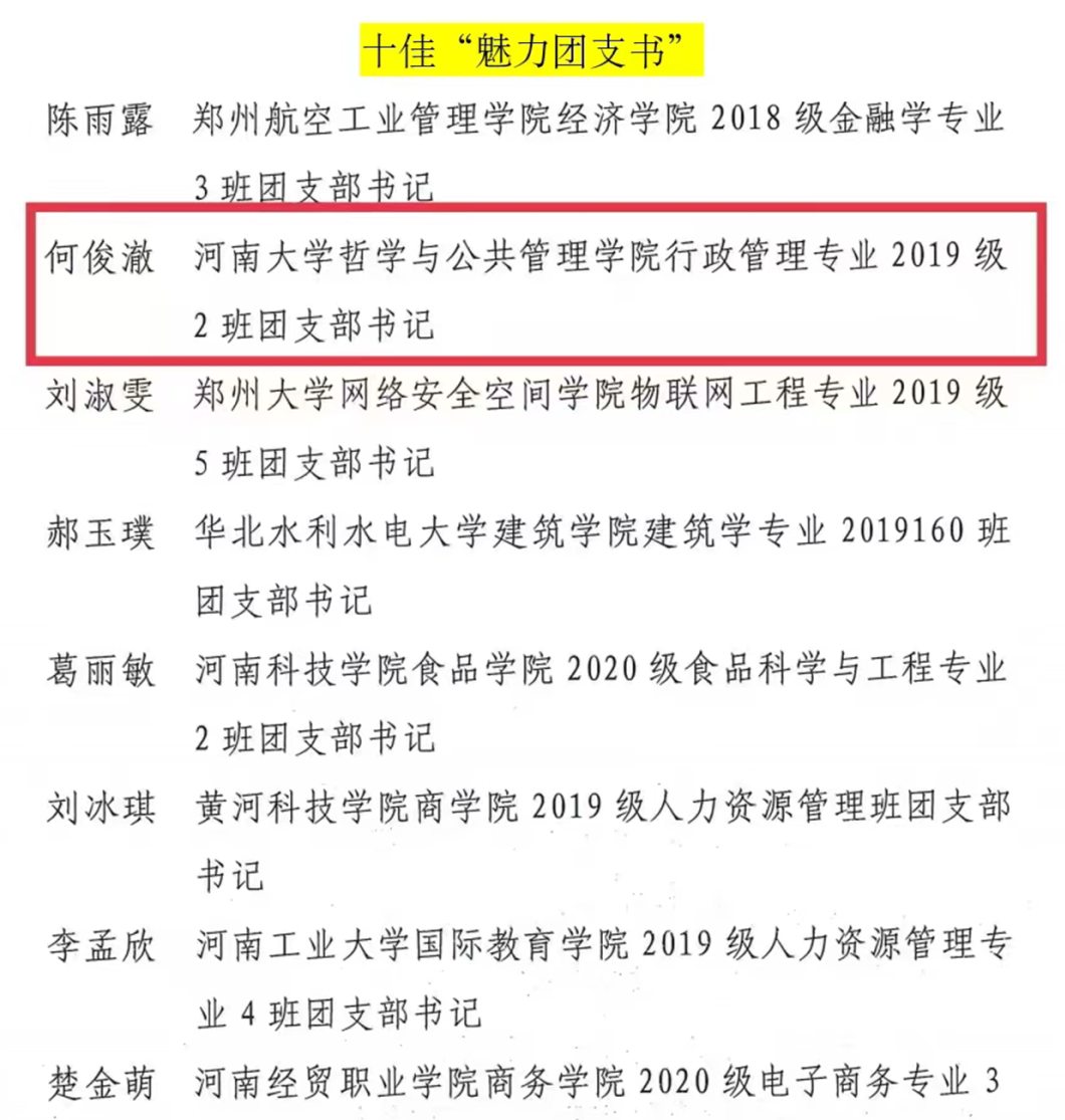 近日,共青团河南省委发布了2022年度“活力杯”河南学校共青团基层基础工作大赛获奖名单。麻豆做爱 “承前启后中国年,听说读写提能力”新年主题系列活动和“广博谦远,明理思哲”“哲管青年说”系列活动荣获共青团工作项目大赛一、三等奖,行政管理专业2019级1班团支部获十佳“活力团支部”奖项,行政管理专业2019级2班何俊澈获十佳“魅力团支书”称号。