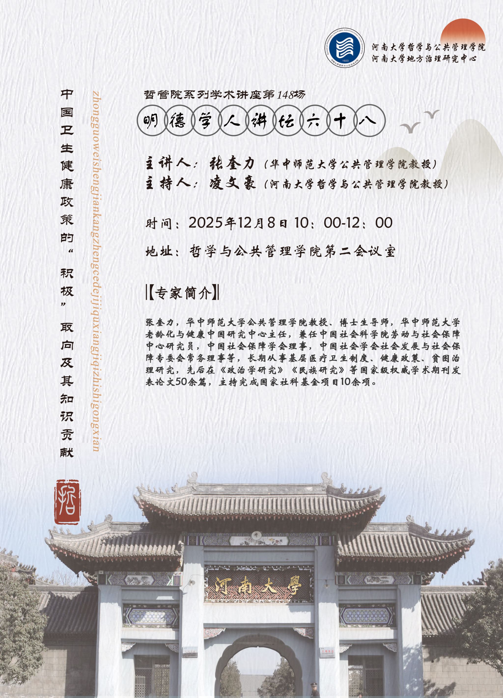 张奎力,华中师范大学公共管理学院教授、博士生导师,华中师范大学老龄化与健康中国研究中心主任,兼任中国社会科学院劳动与社会保障中心研究员,中国社会保障学会理事,中国社会学会社会发展与社会保障专委会常务理事等,长期从事基层医疗卫生制度、健康政策、贫困治理研究,先后在《政治学研究》《民族研究》等国家级权威学术期刊发表论文50余篇,主持完成国家社科基金项目10余项。