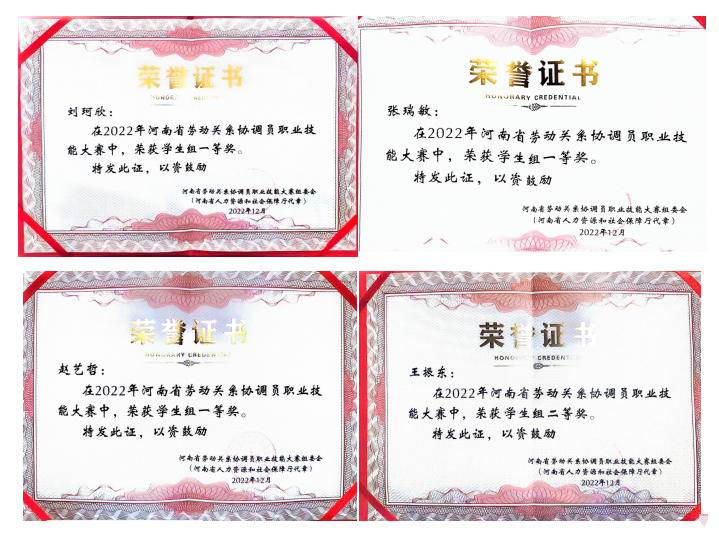 2022年末,这四位同学在2022年第一届“河南省劳动关系协调员职业技能大赛”中展现出卓越的专业素养和技能水平,获得了全省学生组一等奖(共3名)二等奖(共1名)的优异成绩,从而获得了相关认证;河南大学也取得了优秀组织奖。