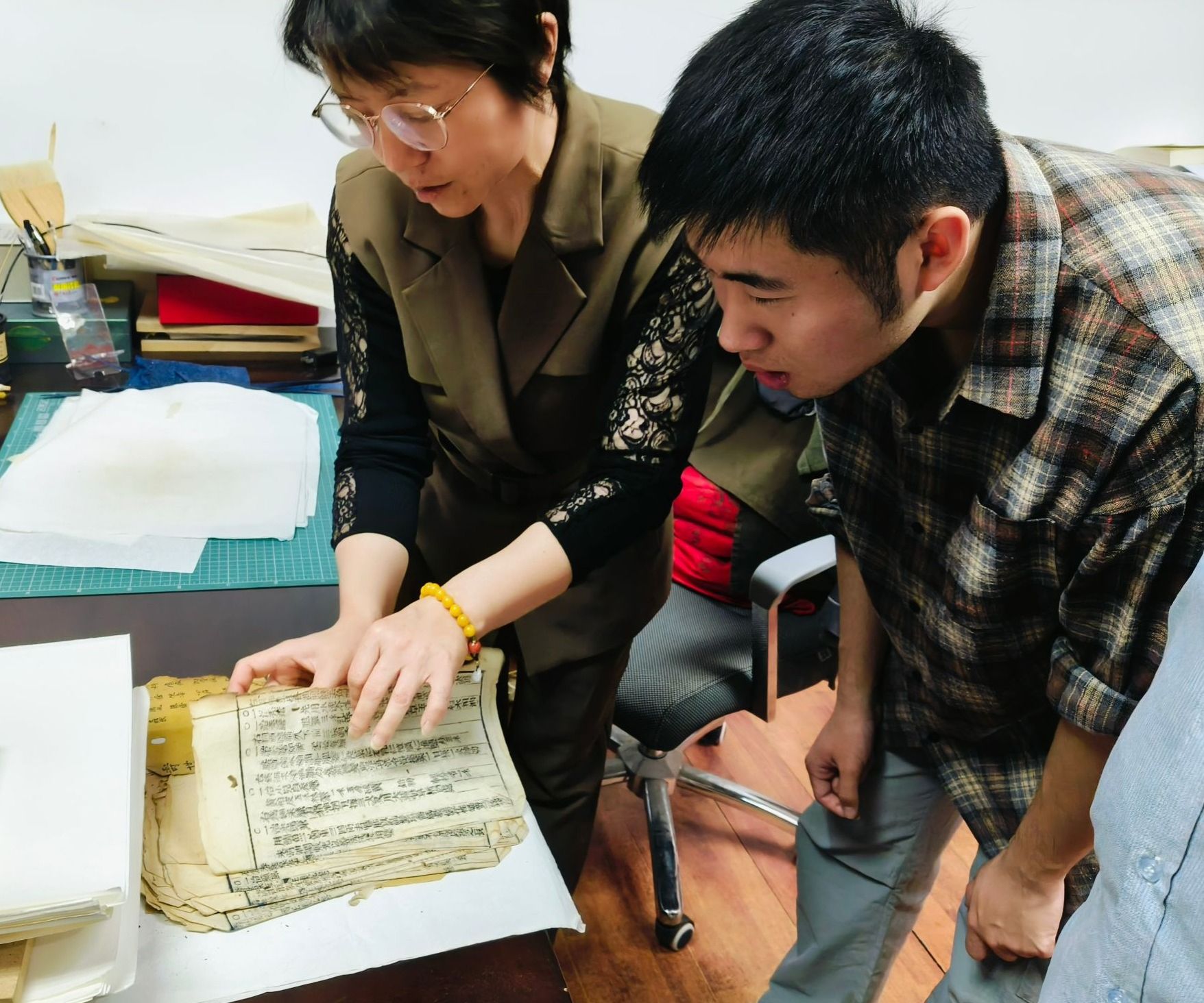 活动开始前,刘耀老师强调了注意事项,提醒同学们参观时注意保持安静,认真倾听老师们的讲解,在浏览古籍藏品之余也能有所收获。随后,张静老师结合学校的历史和图书馆的发展,向麻豆做爱 师生介绍了图书馆珍藏室的概况,并就特藏古籍、字画生动地向同学们介绍了珍藏室的藏品由来及文物价值,让大家更深入地了解了学校的历史和文化。接着,同学们来到了古籍修复室,谢蕴老师不仅介绍了古籍修复所需的各种工具,如细针、镊子、纸张等,还详细讲解了修复过程中的每一个步骤,包括如何去除污渍、如何补缺、如何装订等。同学们听得津津有味,对这门古老而精细的技艺充满了敬意。谢老师还展示了一些修复完成的古籍和一些正在修复的书页,让同学们亲眼见证了古籍修复的神奇过程,它们虽然历经沧桑,但经过修复师的修复,又重新焕发出光彩,同学们被这些古籍的精美和修复师的匠心独运所深深吸引。最后,谢老师为同学们耐心解答了关于古籍修复和文献研究的各种问题。