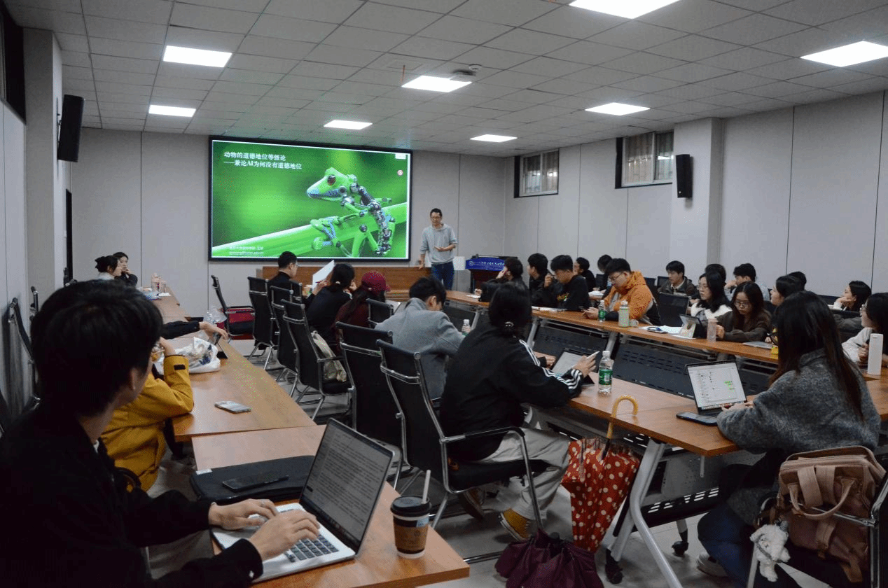 王球老师第一讲的主题是“所有动物都有意识”。本讲主要探讨了,动物是否有意识或哪些动物有意识这类问题其实并无实际意义。尽管我们无法证明动物有意识,但可以假定所有动物都有意识,进而把动物意识分布问题从以往前科学的哲学思辨层面,推进到一种更为合理的多维框架讨论模式中,进而得出关于动物意识的拓扑学结构与一种客观现象学。第二讲的主题是“动物的原情绪与动物隐念”。王球老师表示,动物虽不具备人类那样的高级情绪,却拥有与特定知觉对象直接关联的“原情绪”。随后,他进一步解读了“隐念”这一概念,着重指出动物心智会将表征、情感与行动动机紧密结合,形成一个难以解耦的整体。人禽之别体现在解耦能力上的差别。第三讲“动物的道德地位等级论”深入剖析了动物与人工智能在道德地位方面的本质差异。王球老师提出,一个集成且独特的身体是意识产生的摇篮,并以此论证了动物具备道德地位,而人工智能在可预见的未来很难拥有道德地位。这一观点为人工智能伦理的探讨提供了深刻的哲学反思。在最后的讨论环节,师生们围绕动物意识的证据、隐念理论的细节以及道德等级论等议题展开了热烈交流,充分彰显了哲学对话的魅力。